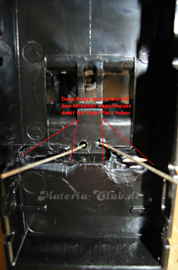 Die Löcher wie bei der anderen Anleitung nach oben in die Kammer für die LED machen und die oberhalb angrenzende Kante abfeilen, damit die Zuleitungen da vorbei passen (deutlich mehr als auf dem Bild hier zu sehen!).