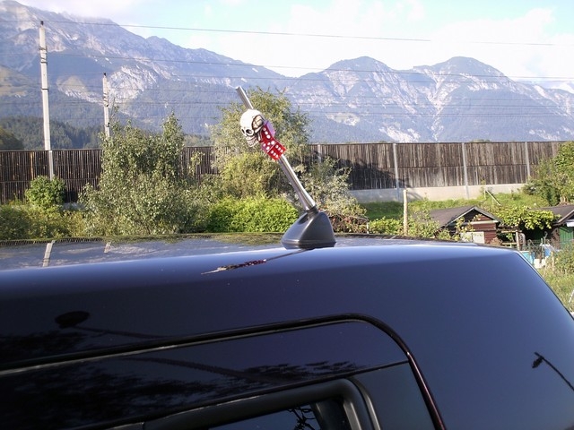 Weitere Veränderungen: Mittelarmlehne (Nachbau, gekauft bei ebay), Spritzdüsen verchromt, verchromte Standuhr in der Form eines Rückspiegels - innen, Seitenblinker mit Chromgitter, neue Antenne in Alu mit selbstgemachtem Antenna Topper (2 Würfel mit Totenkopf), Hello Kitty Plüschfigur, Teppich im Kofferraum und in den Getränkehaltern und Ablagen, Kleiner Weitwinkelspiegel im Rückspiegel, Blendstreifen in der Windschutzscheibe.